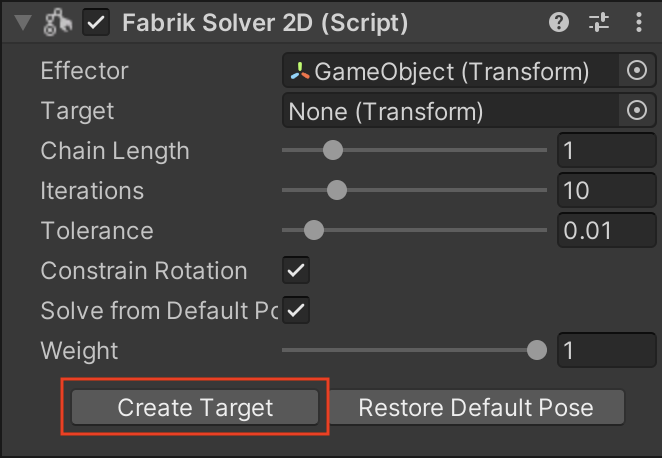 | Restore Default Pose | 有効の場合は、2D IK を適用する前にボーンを元の位置に復元します。無効の場合は、Effector の現在の位置と回転を基準に 2D IK を適用します。 |