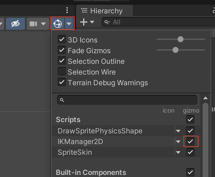 シーンビューウィンドウの右上にある Gizmos ドロップダウンメニューをクリックし、IKManager2D (メニュー: Gizmos > Scripts > IKManager2D) のオン/オフを切り替えることで、IK ギズモの有効/無効を切り替えることができます。