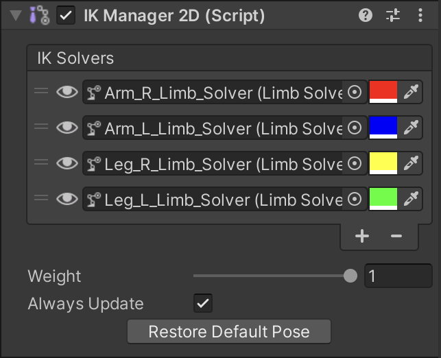 Weight は、Solver の解がチェーン内のボーンやトランスフォームの位置にどの程度影響するかを表す測定値です。IK Manager 2D にはマスターの Weight プロパティがあり、これが制御しているすべての Solver に影響します。このプロパティは、Solver の個々の Weight 設定に加えて適用されます。
