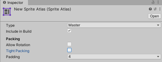 さらに、Sprite Shape で使用するスプライトがスプライトアトラスに含まれている場合、そのスプライトを Sprite Shape で使用できるように、スプライトアトラスのプロパティで Allow Rotation と Tight Packing の両方を無効にします。