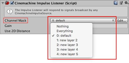 Cinemachine Impulse Listener のインスペクター内で、Channel Mask のドロップダウンメニューの隣にある Edit ボタンをクリックします。