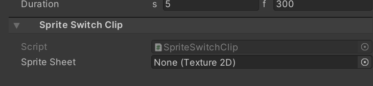 Timeline を使って、Sprite Switch クリップトラックを作成し、Sprite Switch クリップを追加します。初期クリップは空っぽにします。次に、Splete Sheet スロットに別のテクスチャを割り当てます。Timeline が再生されると、スプライトのベーステクスチャはこの新しいテクスチャに変更されます。