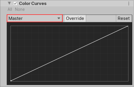 - Inspector で Add Override > Post-processing へ移動し、Color Curves をクリックします。これで HDRP は Volume が影響を与えるすべてのカメラに対して Color Curves を適用します。