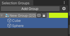 Selection Groups のウィンドウが開かれ、このウィンドウをヒエラルキーウィンドウの横にドッキングするのをお勧めします。 - Selection Groups のウィンドウで "Add Group" をクリックすると、ウィンドウ内に新しい項目が表示されます。