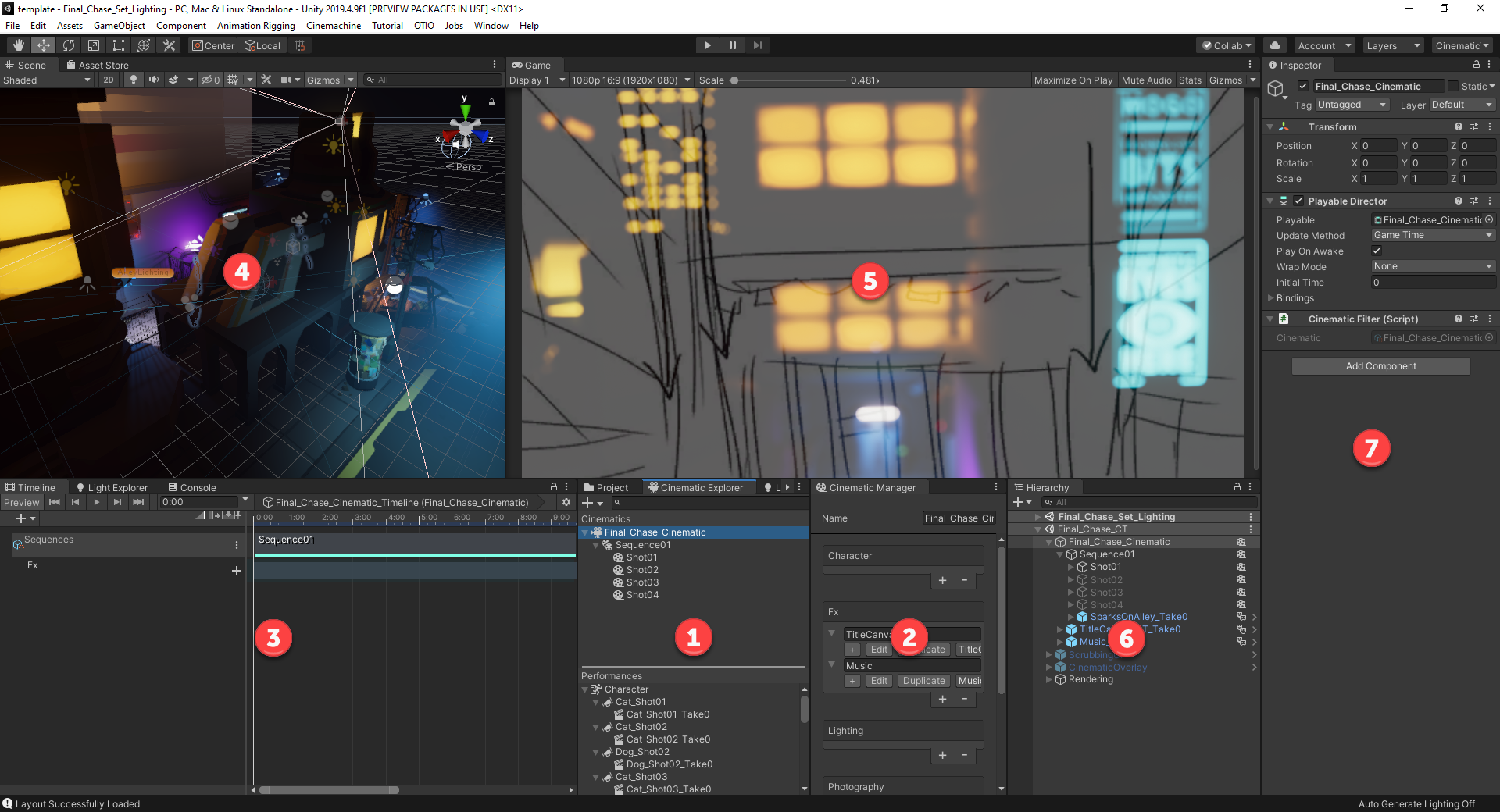 Timeline ウィンドウ | • Sequencesをナビゲートして、組み立てたコンテンツをコンテクストでプレビューできます。 • Sequencesの編集、トリミング、並べ替え。 • 特定のSequencesで使用されるシーンのアクティベーションを管理します。 |