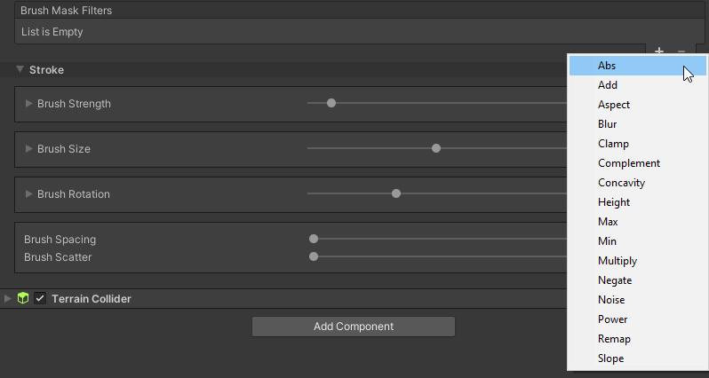 フィルターには、既存の Terrain データを使用して最終的なマスクを計算するタイプと、演算操作を使用してマスクを直接変更するタイプの 2 つがあります。