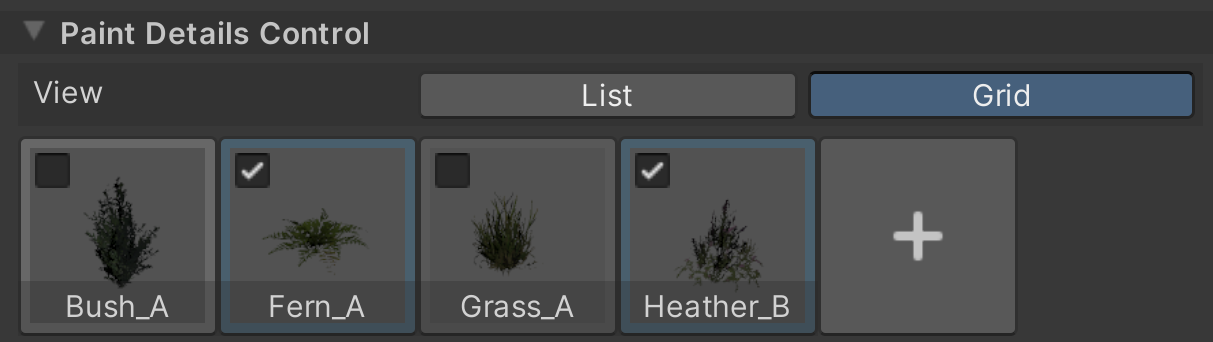 このツールを設定するには、新しいディテールを Details Control に追加します。Asset Store から、無料の Terrain Tools Sample Asset Pack などのプリセットディテールをダウンロードできます。