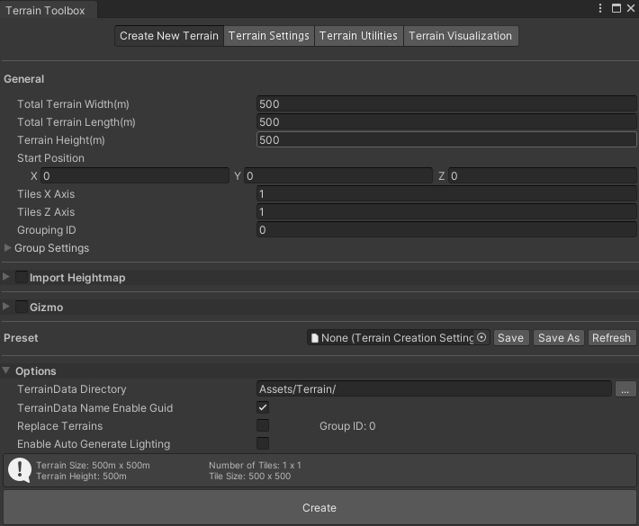 Terrain Toolbox の Create New Terrain ウィザードでは、新しい複数タイルの Terrain (地形) を作成し、Terrain のサイズなどを前もって設定できます。また、インポートした Raw ハイトマップや一連のハイトマップから新しい Terrain を作成することもできます。
