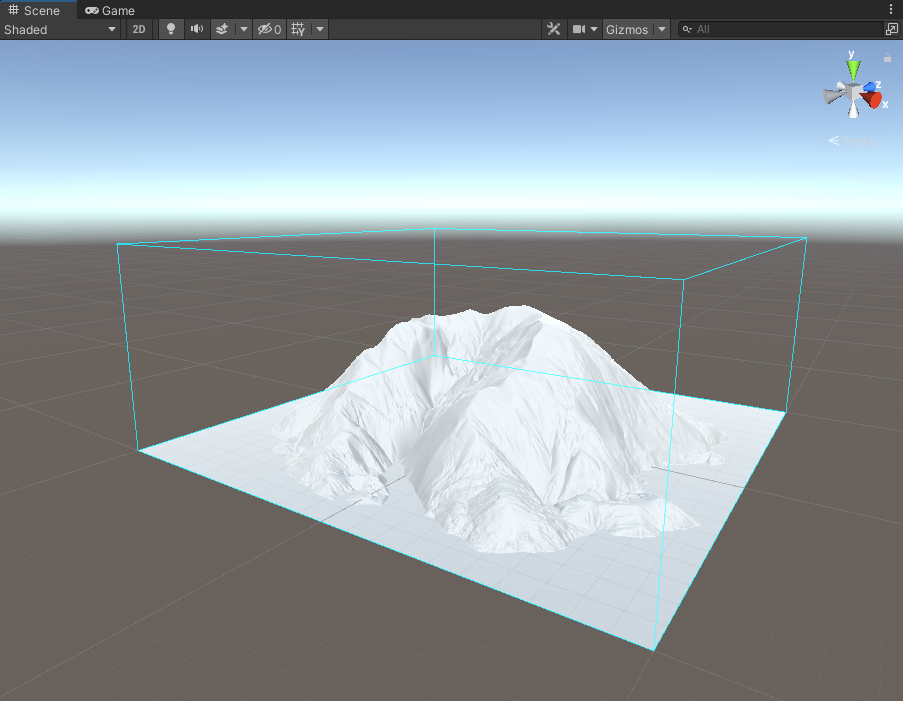 Gizmo (ギズモ) は、シーンビューに表示される透明なキューブで、Terrain (地形) の位置やスケールを確認するのに役立ちます。チェックボックスをオンにするとギズモが表示され、オフにすると削除されます。チェックボックスの横にある矢印をクリックすると、ギズモの Edit Bounds ボタンが表示されます。