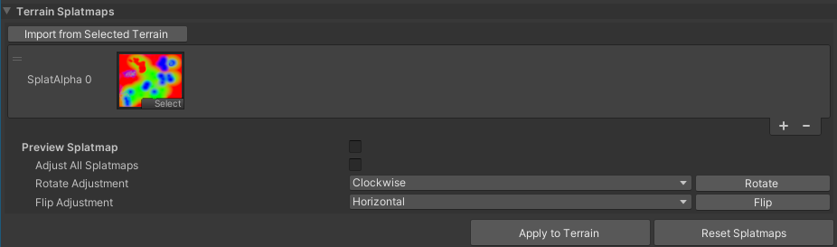 Import from Selected Terrain ボタンを使用すると、選択した Terrain からスプラットマップをインポートできます。右下の追加 (+) および削除 (-) ボタンを使用すると、スプラットマップを追加または削除できます。リスト内の位置を変更するには、スプラットマップの行をドラッグして上下に移動させます。