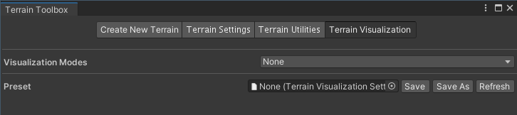 Terrain Visualization ウィザードには、編集の際に Terrain (地形) のさまざまな側面を簡単に可視化できるツールが含まれています。Visualization Modes ドロップダウンメニューを使用して、モードを選択します。現在、オプションは None と Altitude Heatmap のみです。