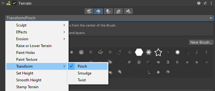 Terrain タイルを選択して Terrain の Inspector を表示します。Terrain の Inspector で、Paint Terrain アイコンをクリックし、Terrain ツールのリストから Transform > Pinch の順に選択します。