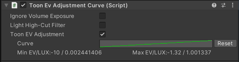| Toon EV adjustment curve | エディット可能なカーブを使って補正をおこないます。しかし0ルクスから13万ルクスまでの範囲を制御するカーブを個々のアーティストが描くことは現実的ではありません。 Toon EV Adjustment は、本画面においては、ブライトネスの単位を表すためにEVを使っています。デフォルトのカーブは、-10 EVから-1.32 EVまでの範囲となっています。 |