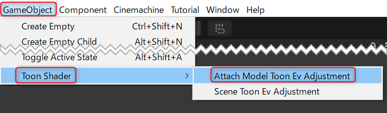 特定のモデルを選択した状態で、 GameObject/Toon Shader/Attach Model Toon EV Adjustment を選択することで、Toon EV Adjustment を特定のモデルにのみ作用させることができます。
