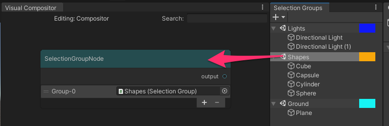 [ノードの一般的な作成方法](visual-compositor-window.md#creating and-deleting-nodes) に加えて。 Selection Group ウィンドウから Visual Compositor ウィンドウにグループをドラッグして、このノードを作成することもできます。