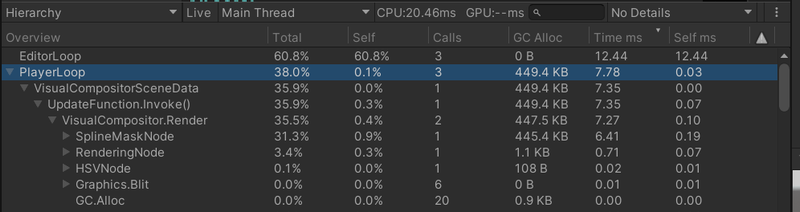 プレイモード中にプロファイラーウィンドウで各ノードのパフォーマンスを見ることができます。