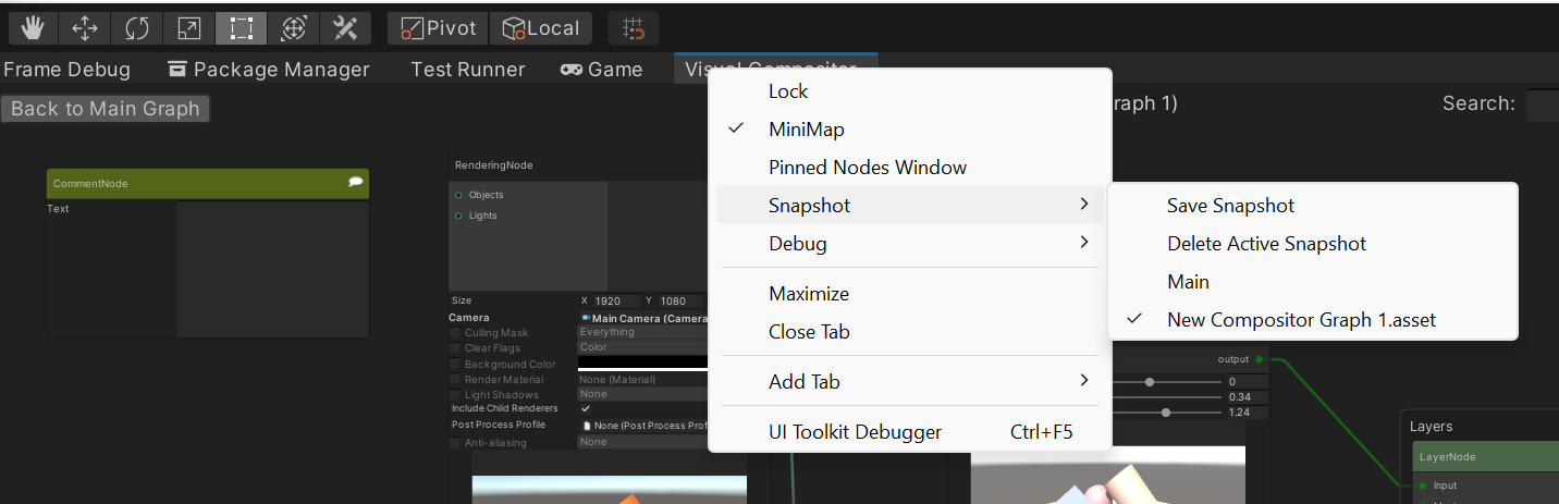 Snapshot とは、compositor graph の保存されたコピーのことです。Snapshot を保存するには、ウィンドウタブのコンテキストメニューを起動し、Snapshot → Save Snapshot を選択します。これにより、グラフのコピーが作成され、同じコンテキストメニューにグラフを読み込むメニュー項目が追加されます。
