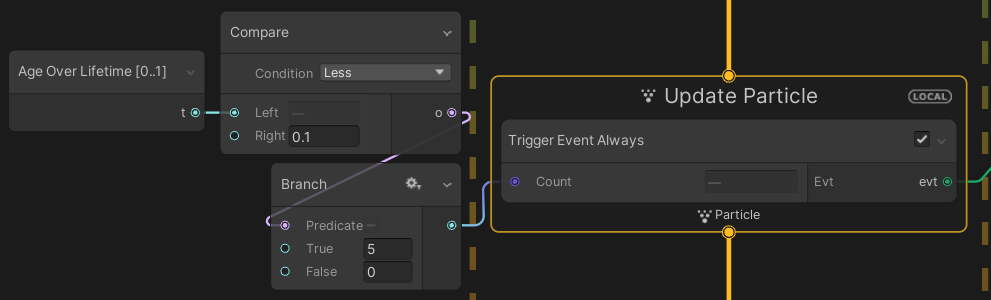 Trigger Event Always ブロックは、GPU イベント を介し、各フレームで特定数のパーティクルの継続的作成をトリガーします 。Trigger ブロックは常に、ブロックが ブラックボード のどこにあるかに関わらず、Update の終わりに実行されます。