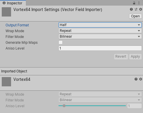 VF ファイルをインポートする際、Unity は Inspector で以下の設定を提供します。