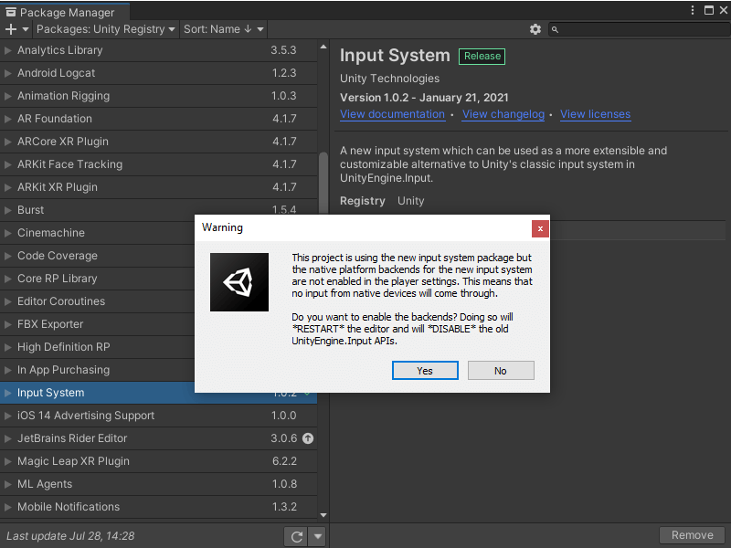 新しい Input System だけを使用したい場合は、警告のポップアップウィンドウで Yes を選択してください。