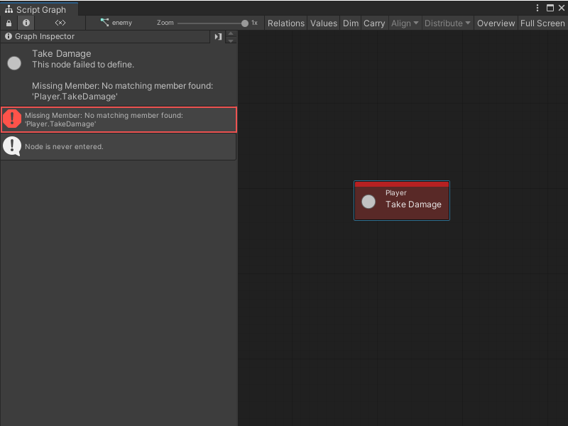 Graph ウィンドウでノードが赤くなり、Graph Inspector に警告が表示されます。