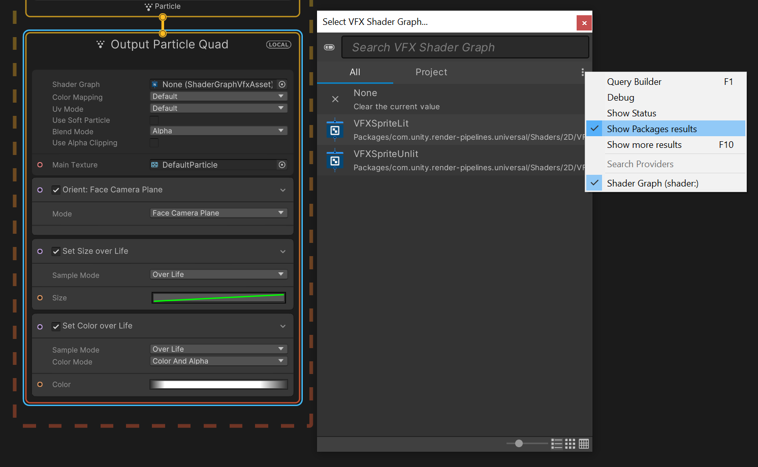 Select VFX Shader Graph ウィンドウで、コンテキストメニューを開き (右クリック)、Show Packages results を有効にします。