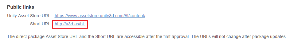 こちらにはアセットページのショート URL を入力してください。ショート URL は Asset Store Publisher Administration セクションの パッケージ タブにあるアセット名をクリックし、ページの下部へスクロールすることで見つかります。