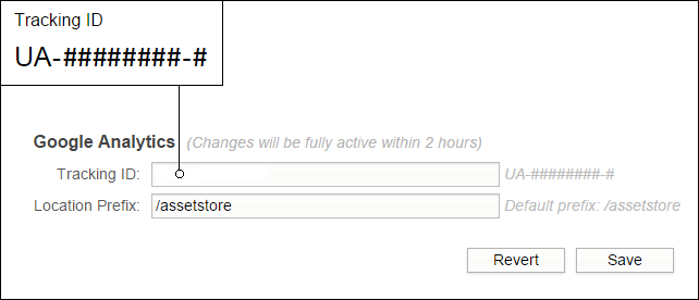 新しいアカウントを作成すると、トラッキング ID を通知されます。トラッキング ID をコピーし、Publisher Administration の Info タブの下部にある Tracking ID テキストフィールドへ貼り付けてください。“Loction Prefix” 用に、/assetstore をデフォルトで入力することもできます。