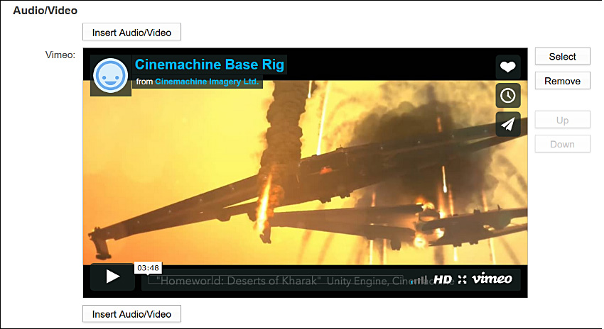 これにより、アセットにオーディオまたはビデオを加え、アセットのスクリーンショットとともにショーリールに埋め込むことができます。これは、以下のいずれかのサービスへリンクを提供することによって可能です。