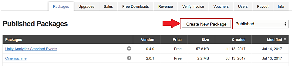 アセットを提出する準備ができたら、パッケージを作成するためのドラフトを作成しましょう。パブリッシャー管理 ページの Packages タブに移動し、Create New Package ボタンクリックします。