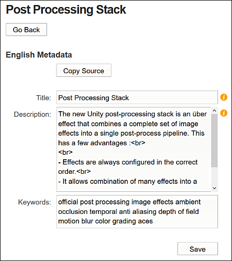 アセットの Description の部分には、太字のテキストにしたり、新しい行にブレークするためにタグが必要です。以下を参照してください。