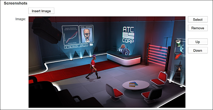 画像をアップロードするために、Insert Image ボタンをクリックして、アセットのスクリーンショットを加えます。このようにして、複数のスクリーンショットを追加することができます。削除したいイメージがある場合は、削除したい画像の隣の Remove ボタンをクリックして削除できます。
