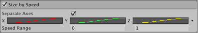 速度によって、パーティクルの幅、高さ、深度を個別に指定することができます。Size by Speed のモジュールで Separate Axes チェックボックスを有効にし、パーティクルの X (幅)、Y (高さ)、 Z (深度) をどのようにその速度と関連付けするかを選択します。