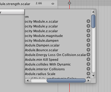 パーティクルシステムをアニメーションにするには、Animator と選択したパーティクルシステムを含むゲームオブジェクトを持つ Animation ウィンドウ を開きます。Add Property をクリックしてプロパティーを加えます。