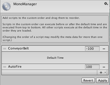 スクリプトをインスペクターから追加するには「+」ボタンを押し、スクリプトをドラッグすることで実行順を変更できます。スクリプトを Default Time (デフォルト時間)の上下に配置することが可能であり、上に配置した場合はデフォルト時間よりも早く実行され、下に配置した場合はデフォルト時間より遅れて実行されます。ダイアログの上から下の順序でスクリプトは実行されます。表示されていないスクリプトはデフォルト時間で実行され、それぞれの順序はランダムとなります。