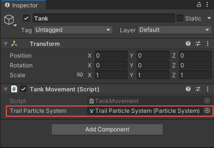 これらのセクションのコード例では、ゲームオブジェクトのトレイル効果のインスタンスごとに Unity が作成したパーティクルの総数を追跡するプロファイラーカウンターを加えます。これらの例では、ゲームオブジェクトの名前は “Tank ”です。