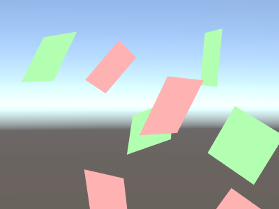 上のシェーダーは、Cull 構文を使い、裏側のカリングを無効にします (デフォルトでは、裏側の三角形はまったく描画されません)。ここで、シェーダーを多数のクアッドメッシュに応用し、異なる方向に回転させます。