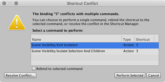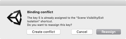 Unity で作業しているときに、競合するコマンドに割り当てられたショートカットを使用すると、Shortcut Conflict ダイアログが開きます。