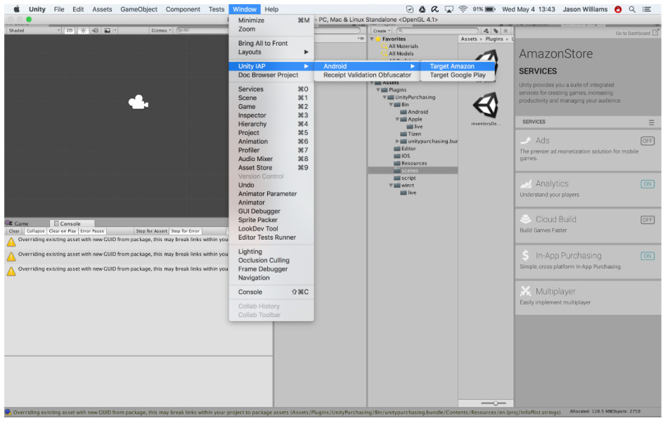 IAP の対象となるストアを設定します。Android アプリケーションはあらかじめ設定しておきます。Window > Unity IAP > Android > Target Amazon の順に移動して対象となるストアを設定します。このようにして、Google、Amazon、他の Android ストアを切り替えます。