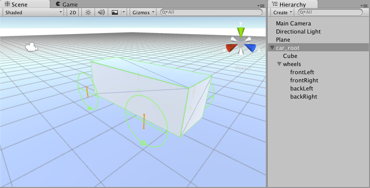 今度は、視覚的なホイールに移ります。ご覧のとおり、Wheel Collider はシミュレーションしたホイール位置と回転を Wheel Collider の Transform には適用しません。そのため、視覚的なホイールを追加するには、いくらか工夫が必要です。