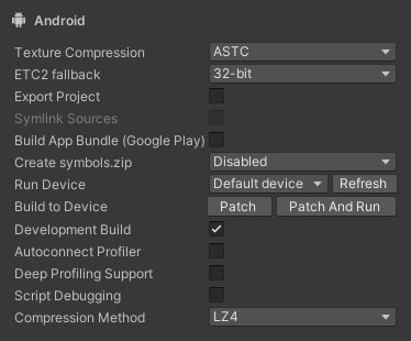 Build to Device | A build pipeline that doesn’t create a full build and instead deploys single files that changed since the last patch directly to the device. Patch deploys changed files to the devices and Patch And Run deploys changed files and then runs the application on the device. For more information, see Application patching. You can only interact with this setting if you enable Development Build. |
