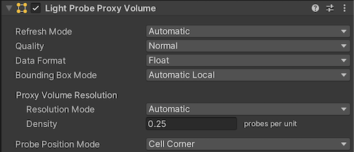 バウンディングボリュームの補間したライトプローブの数は Proxy Volume Resolution プロパティによって異なります。2 つの選択肢があります。