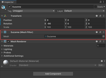 ノート: Mesh Filter が参照するメッシュを変更しても、このゲームオブジェクト上の他のコンポーネントの設定は変更されません。例えば、Mesh Renderer はその設定を更新しないので、予期しないプロパティでメッシュがレンダリングされる可能性があります。このような場合は、必要に応じて他のコンポーネントの設定を調整してください。