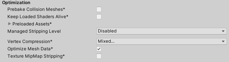 Managed Stripping Level | 使用していないマネージ (C#) コードを Unity がどれだけ積極的に削除するかを選択します。 | |