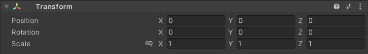 | Scale | X、Y、Z 軸に沿ったトランスフォームのスケール。1 の場合は、元の大きさ (オブジェクトがインポートされた大きさ) になります。 比例によるスケーリングに切り替えるには、値の横にあるリンクのアイコンを選択します。比例スケーリングは、スケール値が比例するように調整します。例えば、ゲームオブジェクトの x、y、z 軸の値が (1, 2, 4) で、x 軸の値を 2 倍にすると、y 軸と z 軸の値はそれぞれ 4 と 8 に変わります。これを有効にすると、比例スケーリングは、シーンビューのスケールツールを使用して行った変更にも適用されます。 スケール値がゼロの場合、グレー表示され、比例スケーリングが有効になっていても自動的に調整されません。 ノート: 比例スケーリングを有効または無効にするキーボード ショートカットを割り当てることができます。ショートカットマネージャー を参照してください。 |