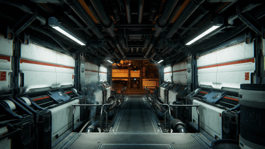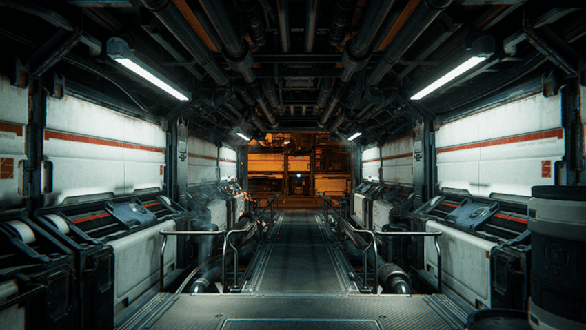 画面パーセンテージ 50 で DLSS なしでレンダリングされた Spaceship Demo プロジェクト。特に火花のビジュアルエフェクトの周辺で、画像がぼやけています。