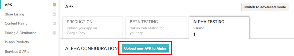ALPHA TESTING を開き、Upload your first APK to Alpha を選択します。該当する APK を選びアップロードします。
