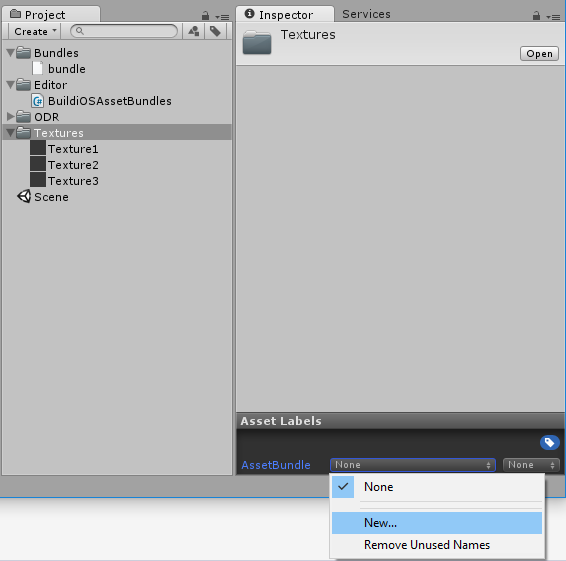 이 예제에서는 “Textures” 폴더에 “textures”라는 레이블이 할당되었습니다. 또한, 새로운 스크립트인 BuildiOSAssetBundles.cs 를 “Editor” 폴더에 생성했습니다.