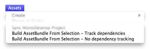 에디터 스크립트는 게임 오브젝트에 적용될 필요는 없으며 대신 에디터에서 사용됩니다. 방금 전의 예제 스크립트는 에디터의 “에셋” 메뉴에서 “에셋 번들 빌드”라는 이름의 새 아이템을 생성합니다.