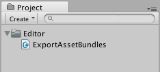 예제를 실행하려면 위의 링크에서 ExportAssetBundles라는 이름의 새 C# 스크립트에 스크립트를 복사하고 붙여넣기합니다. 이 스크립트는 Unity 에디터에서 작동하도록 에디터 폴더에 배치합니다.